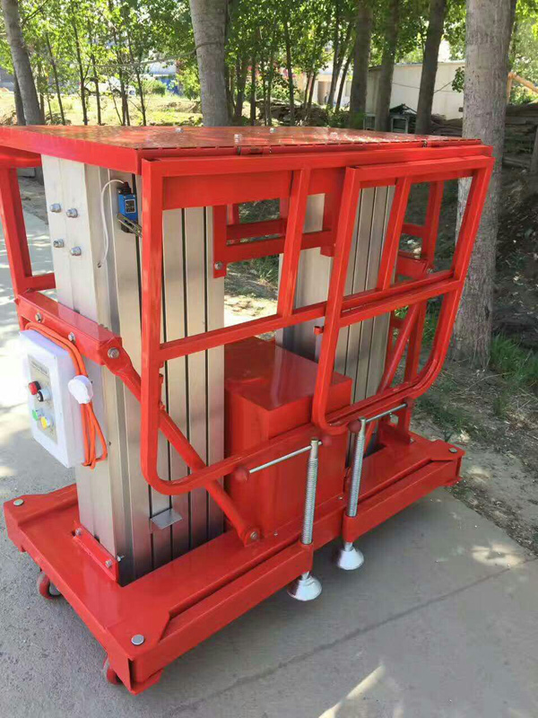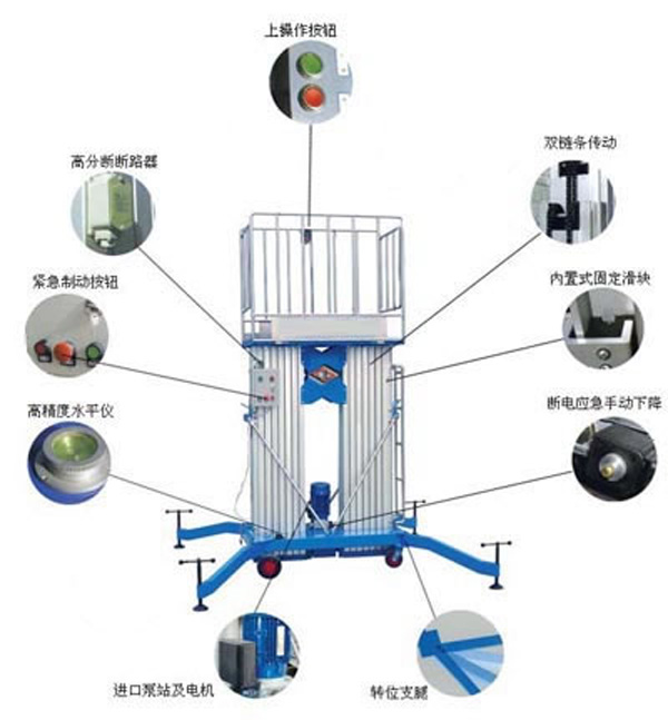 鋁合金升降機升高高度在8米以下為單跪柱式,在10米到14米之間為雙跪柱式,15米到18米之間則升為三跪柱式或四跪柱式。通過升降平臺跪柱的增加達到設備在高空的穩定性,保證作業安全,減小設備晃動的幅度,使高空作業更加平穩。該升降平臺配備了中德合資的液壓泵站,該泵站為壓鑄鋁集成閥塊,結構緊湊,系統壓力16MPa,經過液壓泵站帶動鏈條傳動,結構合理,設計緊湊。鋁合金式液壓升降平臺下降速度可自調,而且設備設有手動下降裝置,保證在停電時的正常工作;設有應急停運按鈕;臺面設有防滑絕緣扣板,更換方便,易于清潔,維修方便,有效保障工作安全可靠,保證使用人員的安全。外形美觀,整體輕盈,能在小的空間內發揮好的舉升功能,也可根據客戶要求加裝蓄電池以滿足客戶工作場地的不同要求。